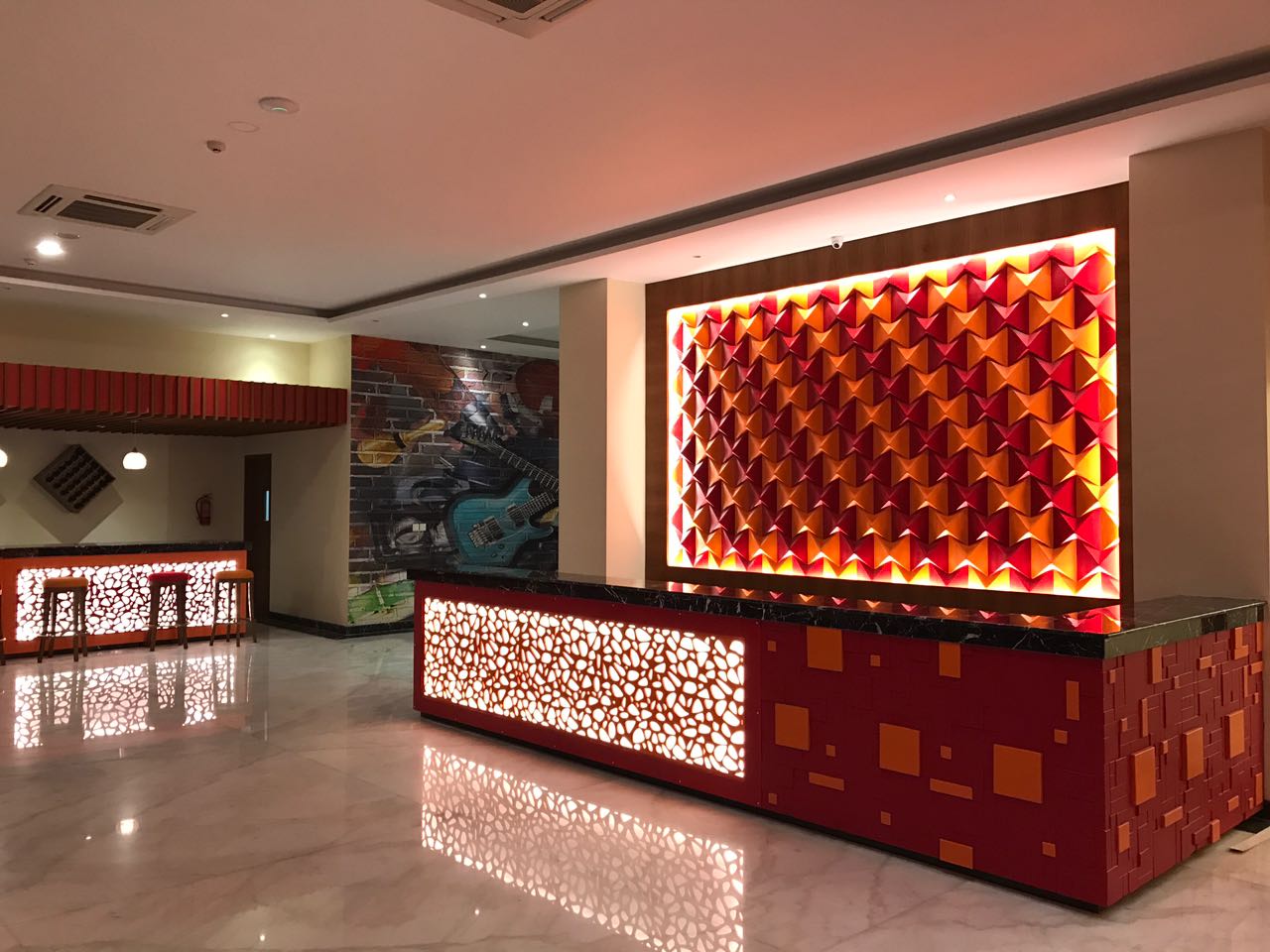 the lobby designed by Azana Hotels & Resorts designer, stealing attention right at the door is a curved feature interior design with a meandering montage