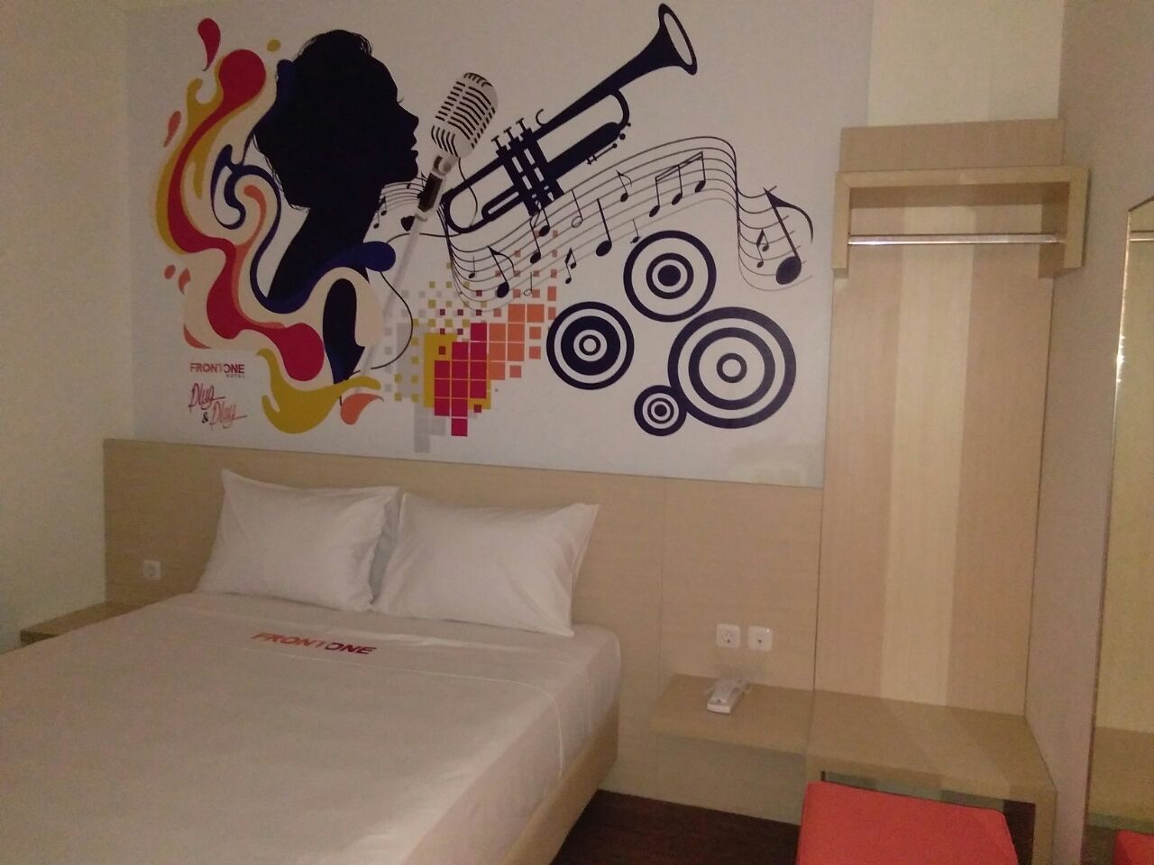 Front One Inn Jombang is a one of a kind smart indulgence. Its designer thematic music rooms and tactile amenities as well as trendy photo wallpaper… and gadgets socket, wow it’s also offers guests a high speed powered internet access and entertainment channels, mini fridge hair dryer, in room safe, wadrobe and slippers, cable TV, quality & trendy bath amenities, makeup mirror